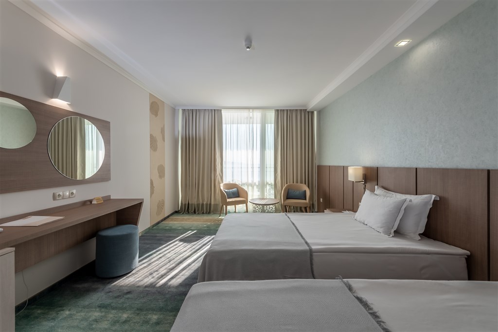 klimatizované 2-lôžkové izby a štúdiá • izby ŠTANDARD a SUPERIOR s možnosťou prístelky (max. 2 dosp. os. + 1 dieťa, resp. 3 dosp. os.) • orientované na park, resp. na morskú stranu • ŠTUDIO pre 2-4 os. (max. 2 dosp. os. + 2 deti, resp. 3 dosp. os.) • orientované na park, resp. na morskú stranu • sprcha/WC • sušič na vlasy • telefón • SAT-TV • malá chladnička • balkón • WiFi pripojenie zdarma • detská postieľka na vyžiadanie za poplatok (obmedzený počet )