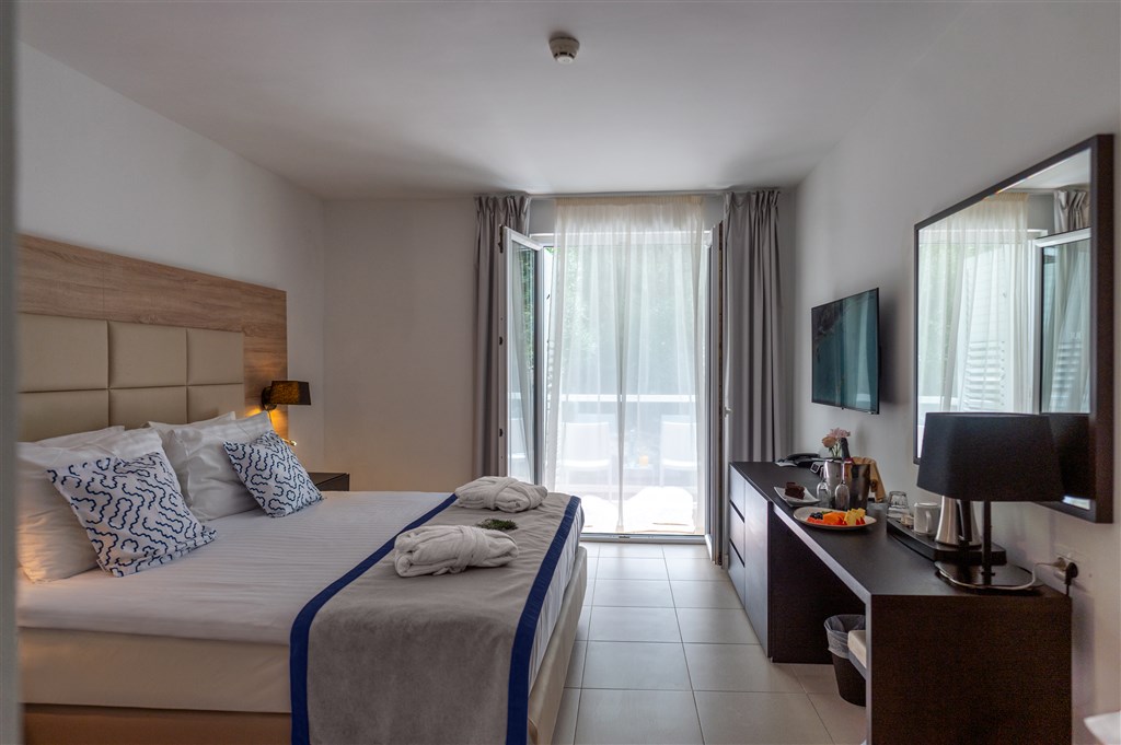 klimatizované 2-lôžkové izby typu standard (24m2) a superior (26m2) a junior suite (cca 30m2) • SAT/TV • sprcha/ WC • fén • minibar • trezor • rýchlovarná kanvica • balkón orientovaný do parku resp. na morskú stranu