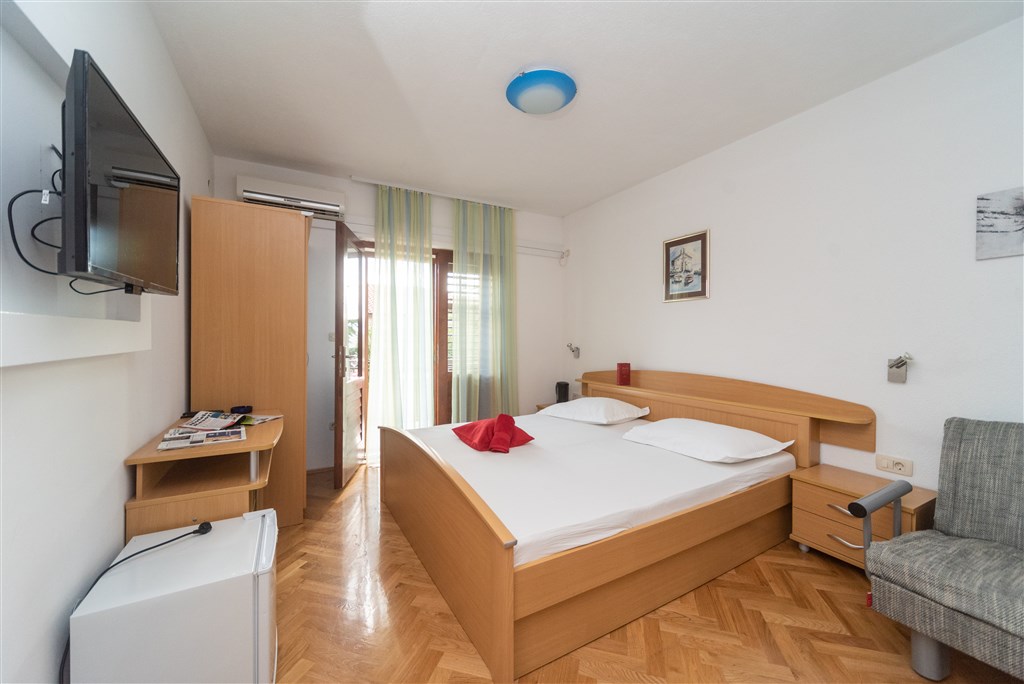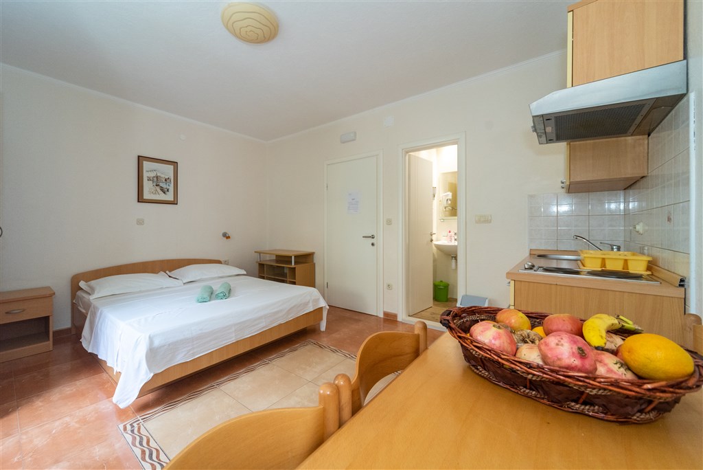 IZBY - klimatizované 2-lôžkové izby s možnosťou prístelky • sprcha/WC • SAT TV • chladnička • balkón • STUDIO/2 resp. TYP STUDIO/2+1 - jedna miestnosť s 2 lôžkami • niektoré s prístelkou • balkón • APP/2+2 - 2-lôžková spálňa • obývacia miestnosť s 2-ma lôžkami (rozť. gauč) • balkón • Všetky apartmány a štúdia majú klimatizáciu • vybavený kuchynský kútik • sprcha/WC • SAT TV